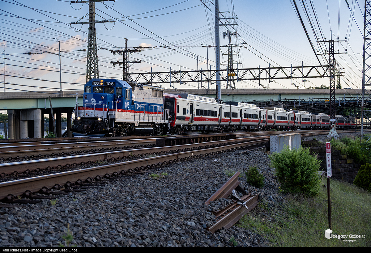 On the evening of September 1st, 2025, Metro-North Railroad train 5548, with EMD GP35r 106, emerges from under I-95 and crosses U.S. Route 1 in Stamford, Connecticut, towing a nine-car consist of Kawasaki M8 railcars en route to New Haven Yard on the New Haven Line.