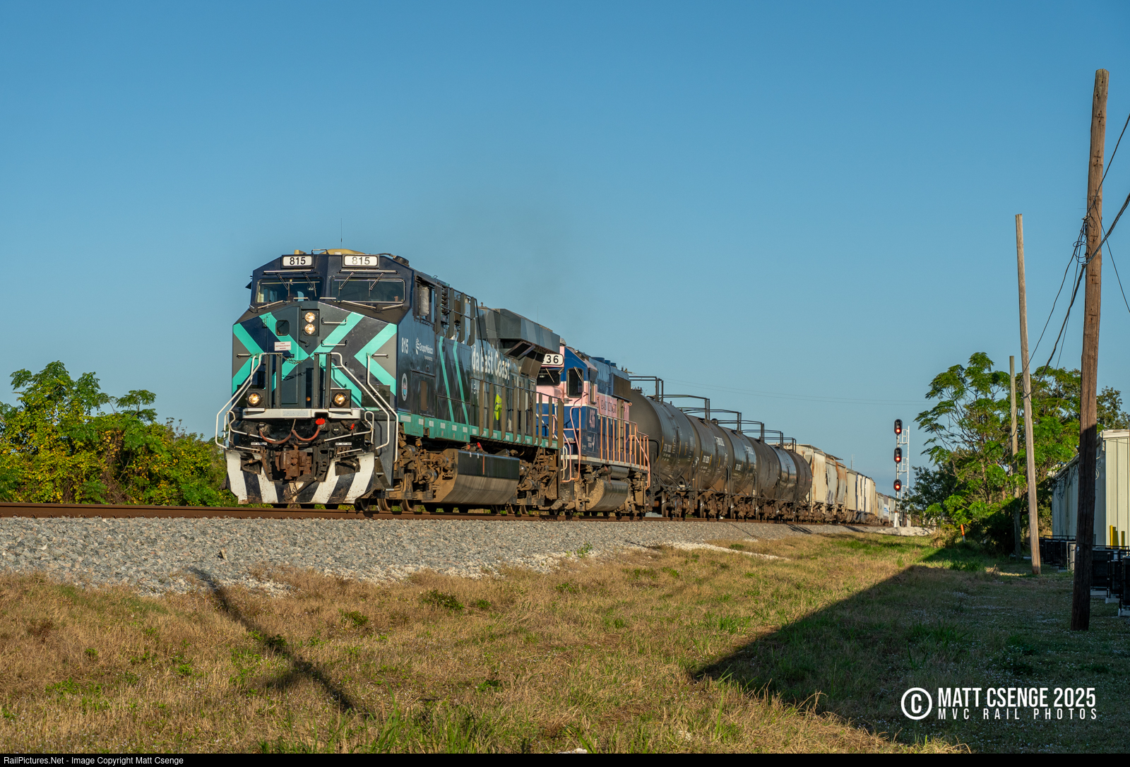 Florida East Coast (FEC) ET44C4 no. 815 and GP40-2 no. 436 are seen leading train 103 through the signals at the Brightline junction in Cocoa, FL. |