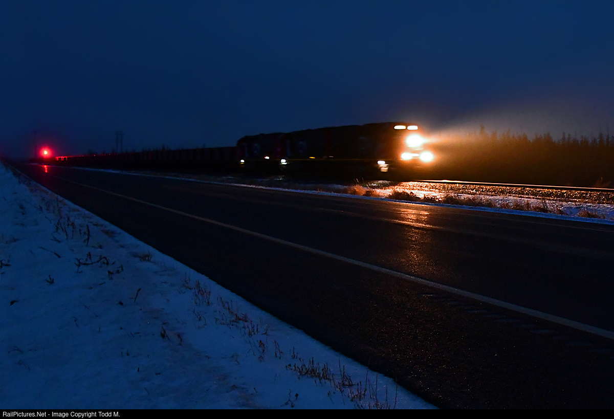 | Running at track speed through the bog while heading north to load iron ore pellets at United Taconite, a trio of DMIR SD40-3s and 140 cars cut through the darkness and fog along the CN Missabe Sub. |