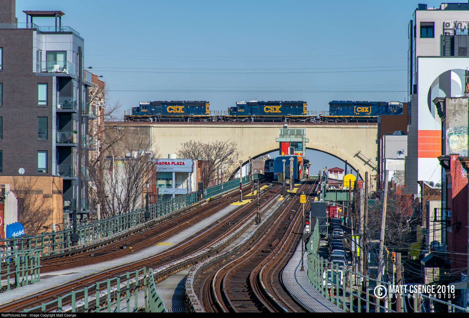 A trio of SD40's lead a long CSX train up the nearly 1% grade to the Hell Gate Bridge, crossing over the terminus of the BMT Astoria Line: Astoria-Ditmars Blvd.
