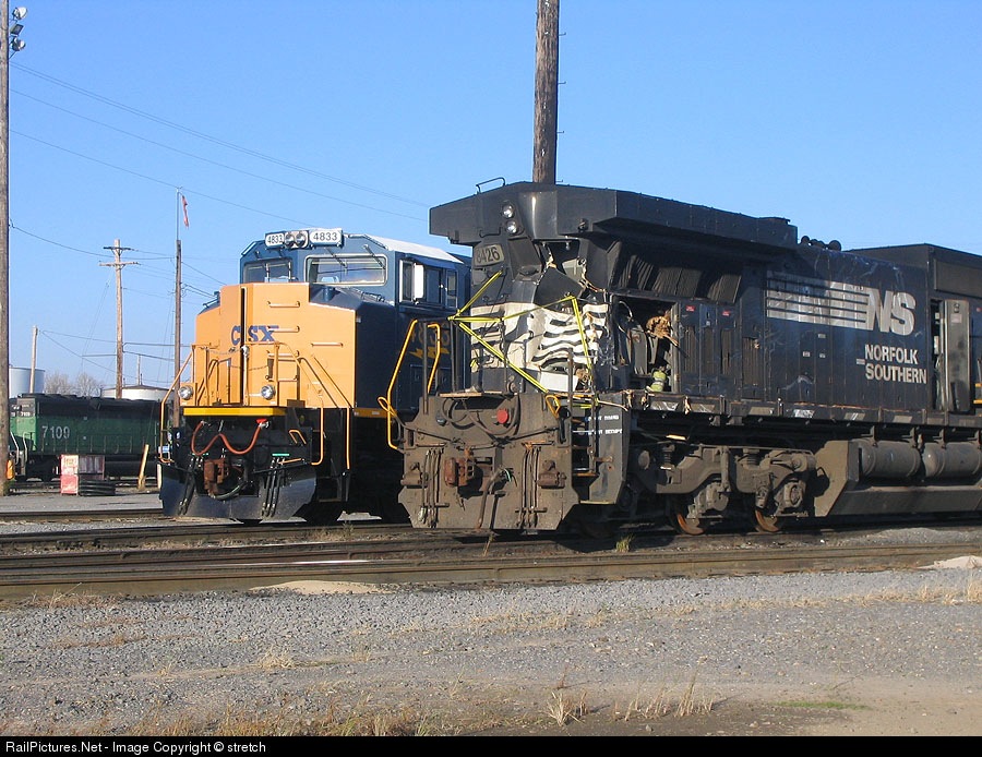 SD70ACe CSXT 4833 sits beside NS 8426, which was damaged in a derailment a month earlier in Pine Bluff.