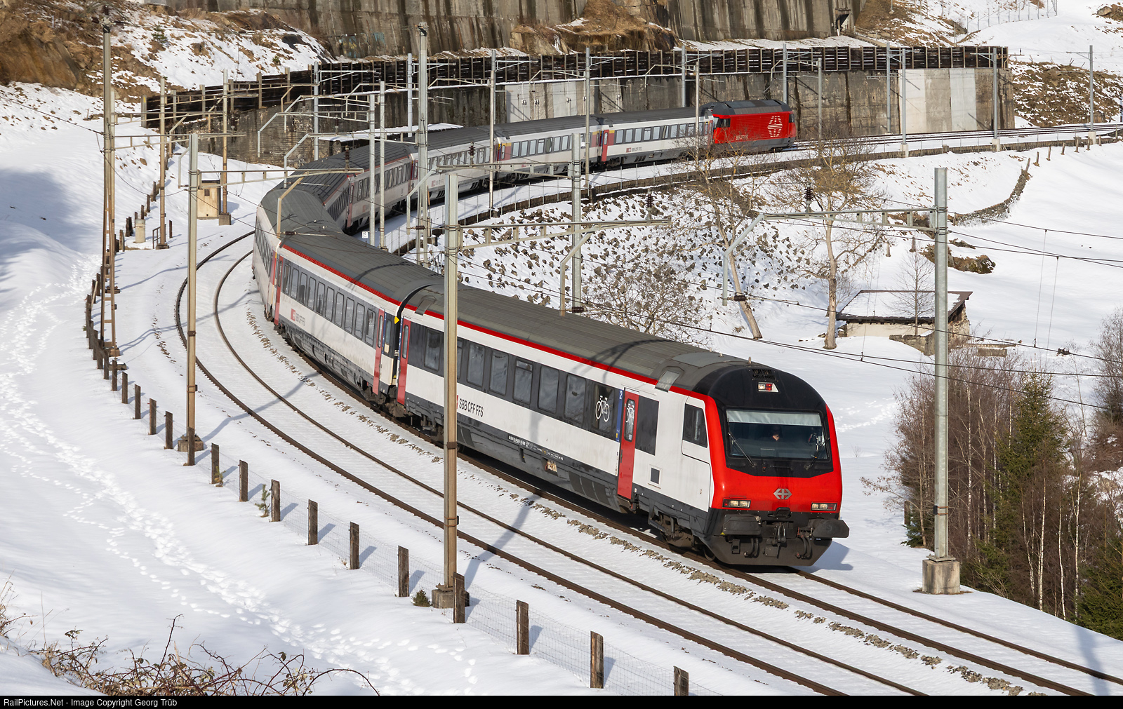 | Due to planned maintenance work in the Gotthard Base Tunnel, most passenger trains will be diverted via the Gotthard mountain route from January 13 to 24, 2026, to ensure that sufficient slots are available for freight traffic in the base tunnel. IC 10671 from Basel via Olten-Lucerne-Arth Goldau-Bellinzona to Lugano is running through the Wattinger curve between Gurtnellen and Wassen, with leading cab car Bt and Re 460 # 016 shoving in the rear. |