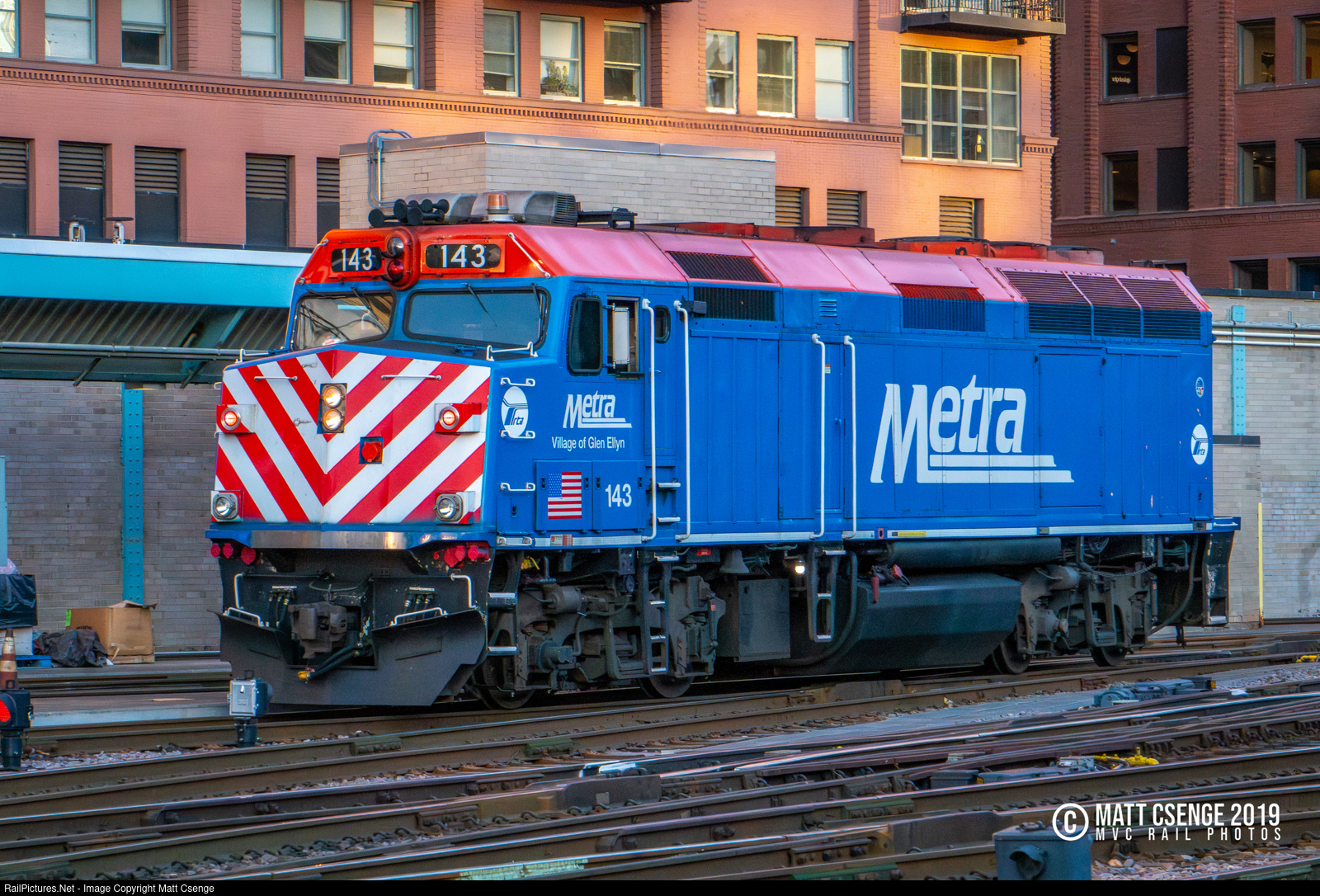 Metra F40PH-3 no. 143 shuffles around the Ogilvie Transportation Center, returning to the locomotive storage tracks. |