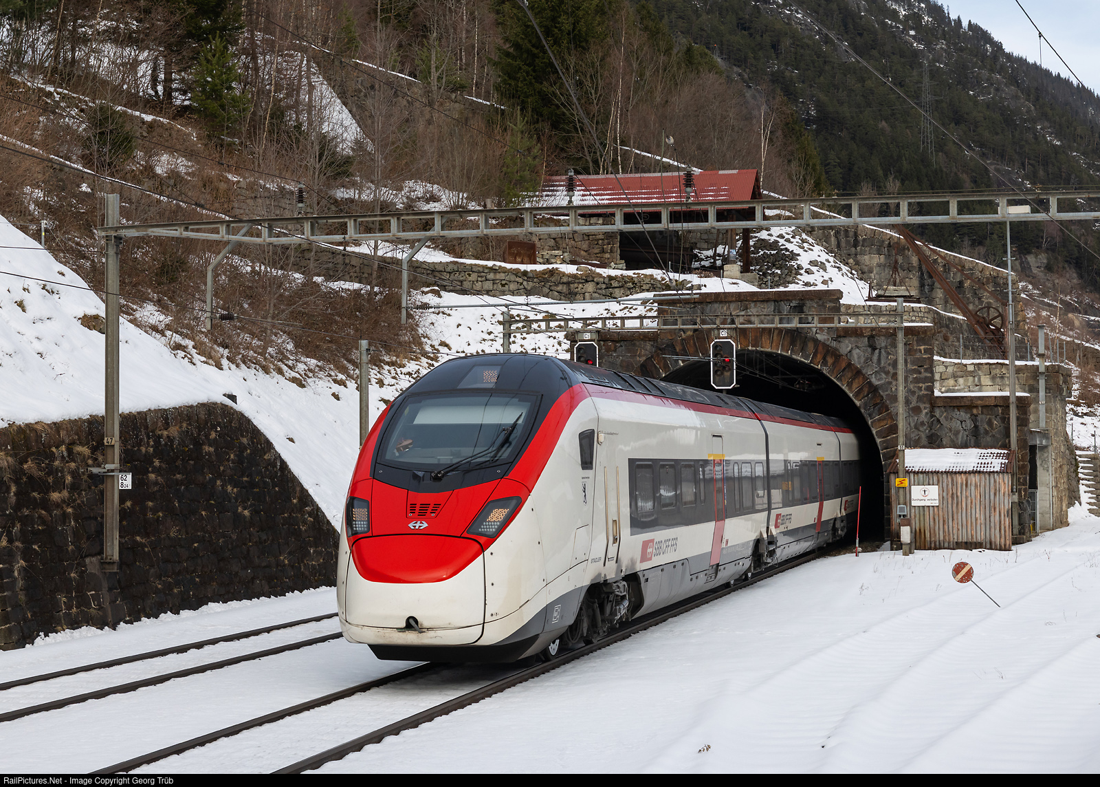 | Due to planned maintenance work in the Gotthard Base Tunnel, most passenger trains will be diverted via the Gotthard mountain route from January 13 to 24, 2026, to ensure that sufficient slots are available for freight traffic in the base tunnel. "Giruno" RABe 501 # 019 "Kanton Appenzell Innerrhoden" is leaving the Entschigtal avalanche protection gallery at Wassen, running as EC 10014 from Milan/Italy via Chiasso-Lugano-Bellinzona-Arth Goldau-Zug to Zürich. |