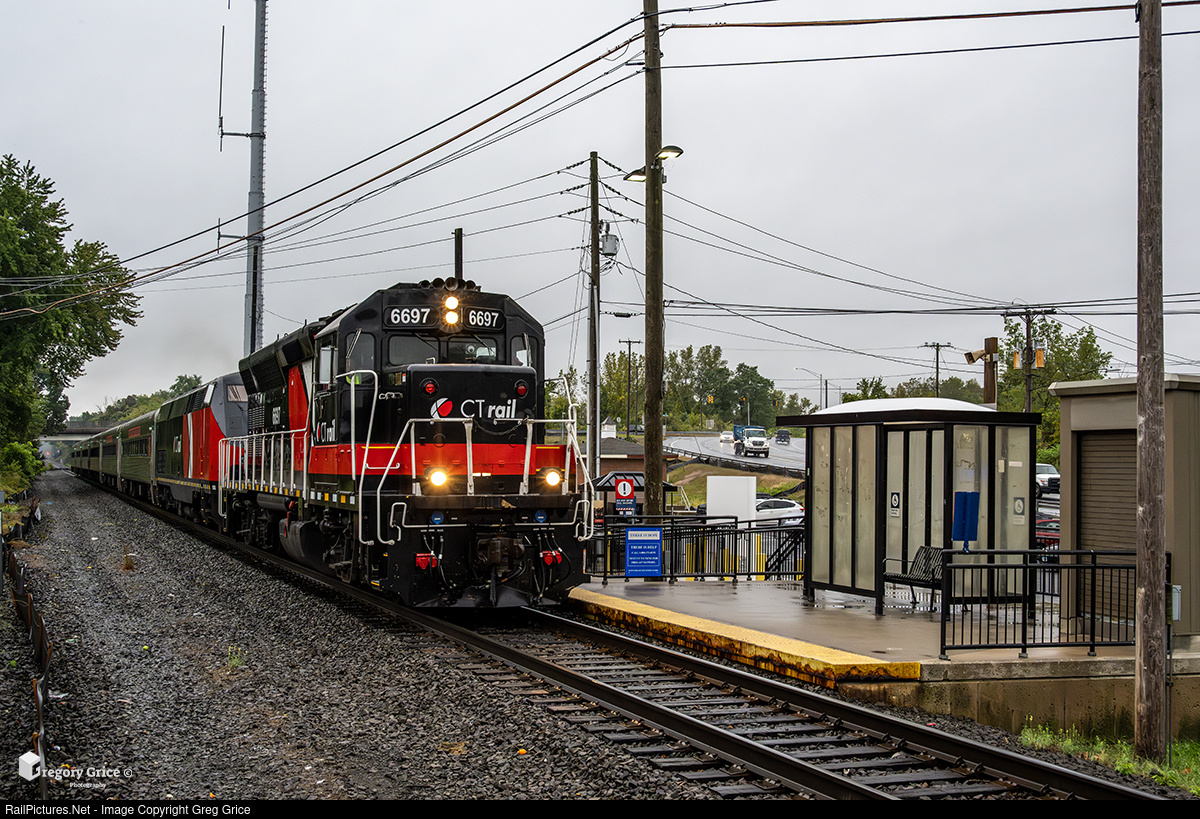 On September 25th, 2025, CTrail Extra 6697, powered by EMD GP40-3H #6697 and GE P40BH 6705, passes the small station at Winsor Locks, Connecticut while heading north up the MRS (Hartford) Line. The 6-car doubleheaded extra train was heading to the Connecticut Army National Guard's Camp Hartell base in Windsor Locks, Connecticut for a joint emergency preparedness exercise.