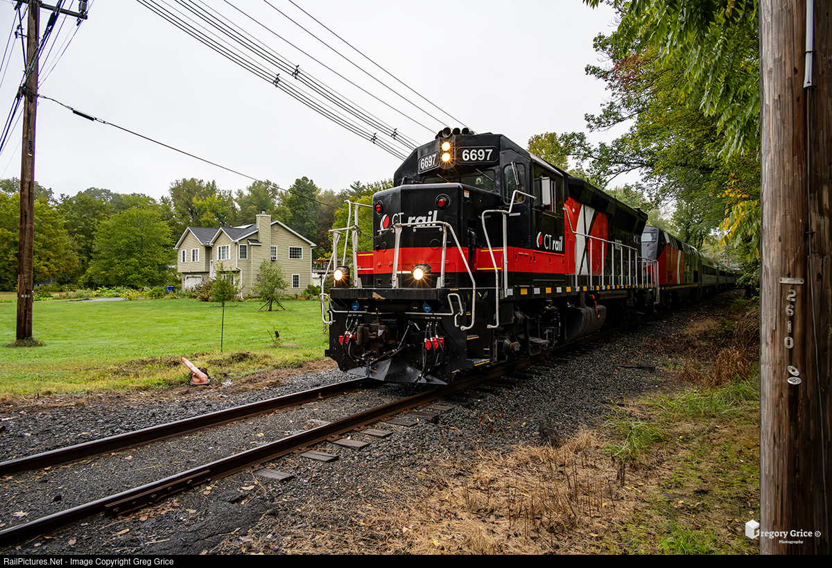 On September 25th, 2025, CTrail Extra 6697, powered by EMD GP40-3H #6697 and GE P40BH 6705, pauses at Suffield Street on the Bradley Industrial Spur in Suffield, Connecticut. The 6-car doubleheaded extra train was heading to the Connecticut Army National Guard's Camp Hartell base in Windsor Locks, Connecticut for a joint emergency preparedness exercise.