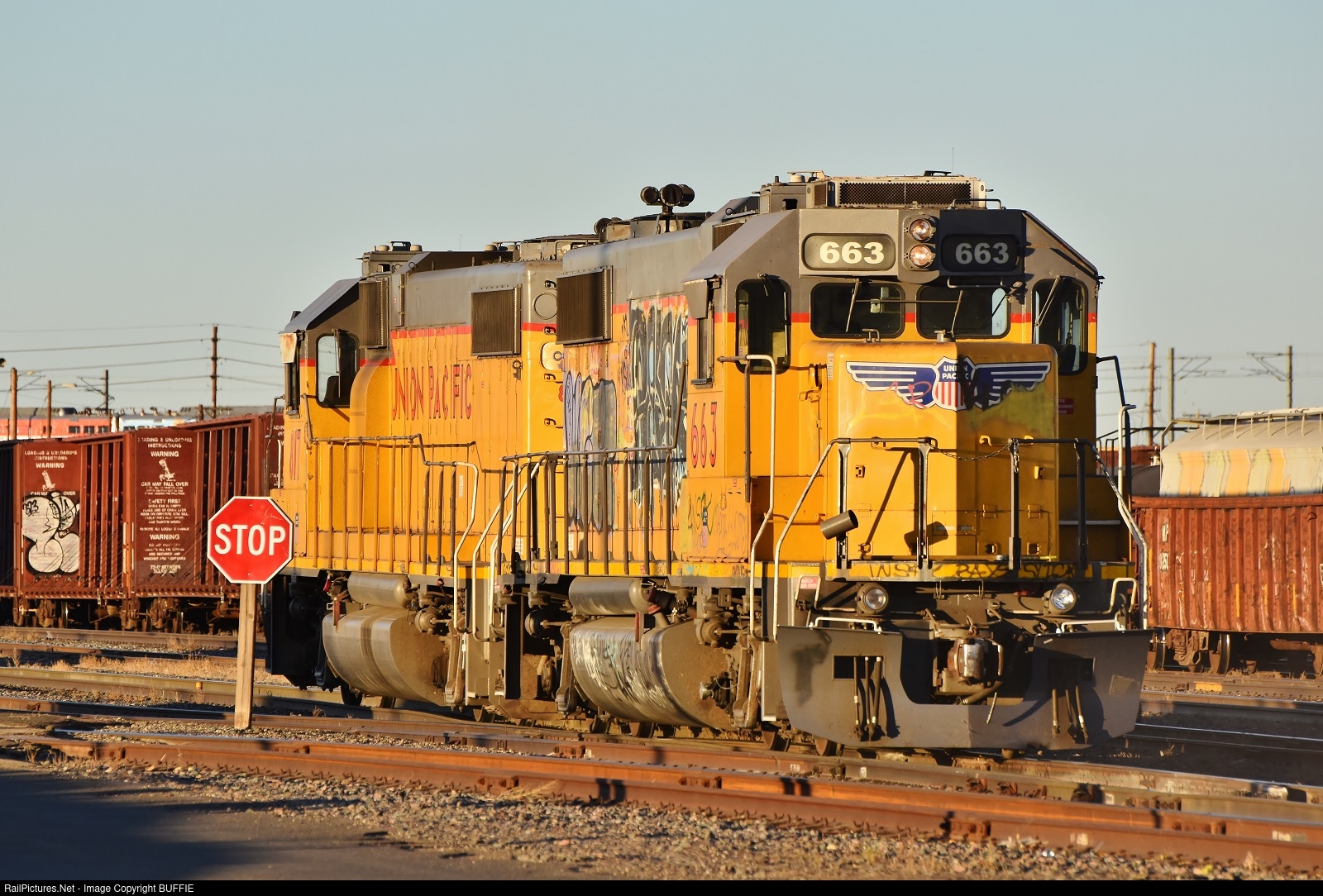 | The sun is setting on the Union Pacific's North Yard as UP 663 (GP38-2) comes in light after shuffling freight cars for a few hours.