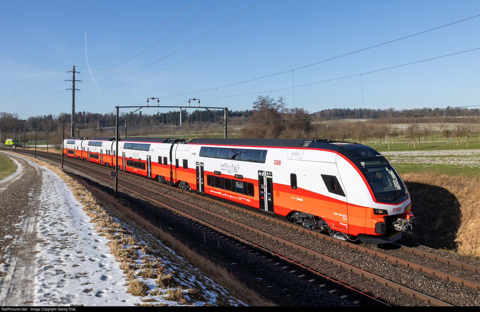 | Four car doubledeck "cityjet" 4734 # 110 from StadlerRail for the austrian ÖBB on the test run 97345 from Sulgen to Romanshorn Seewiesen, between Erlen and Oberaach. The ÖBB has ordered 89 of this type till now. |