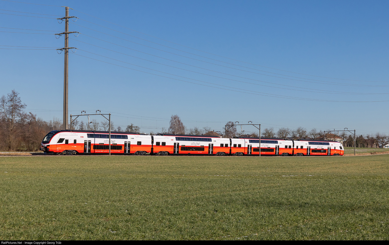 | Doubledeck KISS train "cityjet" 4734 # 110 from StadlerRail for the austrian ÖBB on the test run 97347 from Sulgen to Romanshorn Seewiesen, between Erlen and Oberaach. |