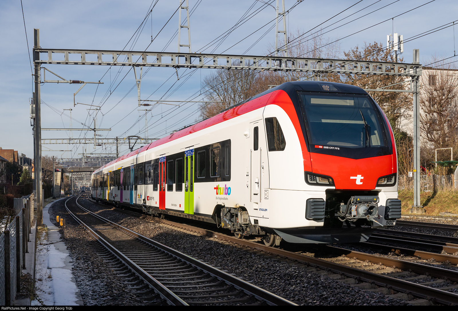 | New "Flirt Evo" RABe 533 # 502 of the Thurbo is running train 20639 of the line S26 from Winterthur via Bauma to Rüti ZH, between Winterthur and Winterthur Grüze. |