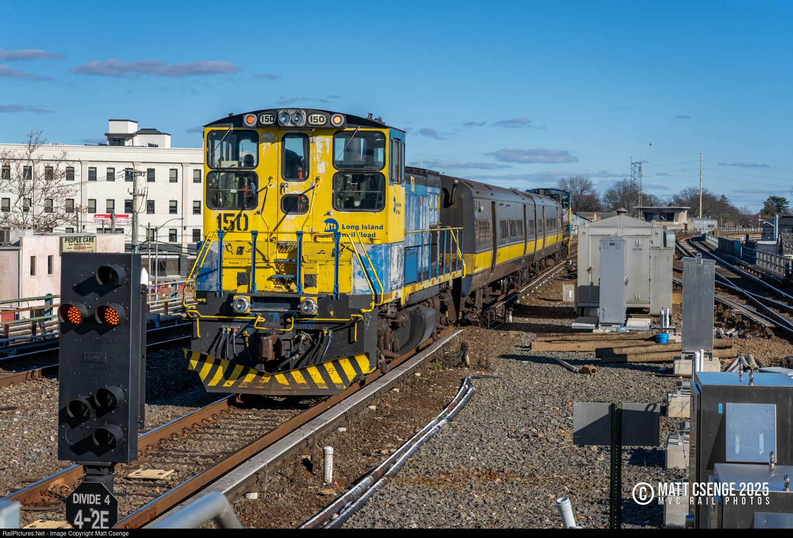 Long Island Rail Road (LIRR) MP15AC no. 150 brings up the rear of the laser train as it heads east towards Huntington. The train is made up of two former Budd M3 multiple units - no.s E932 and E775 - bookended by locomotives 150 and 152. The M3 cars have been modified with high-powered lasers to burn leaf residue off the rails, preventing "slip-slide" conditions that can adversely affect train braking and acceleration. |