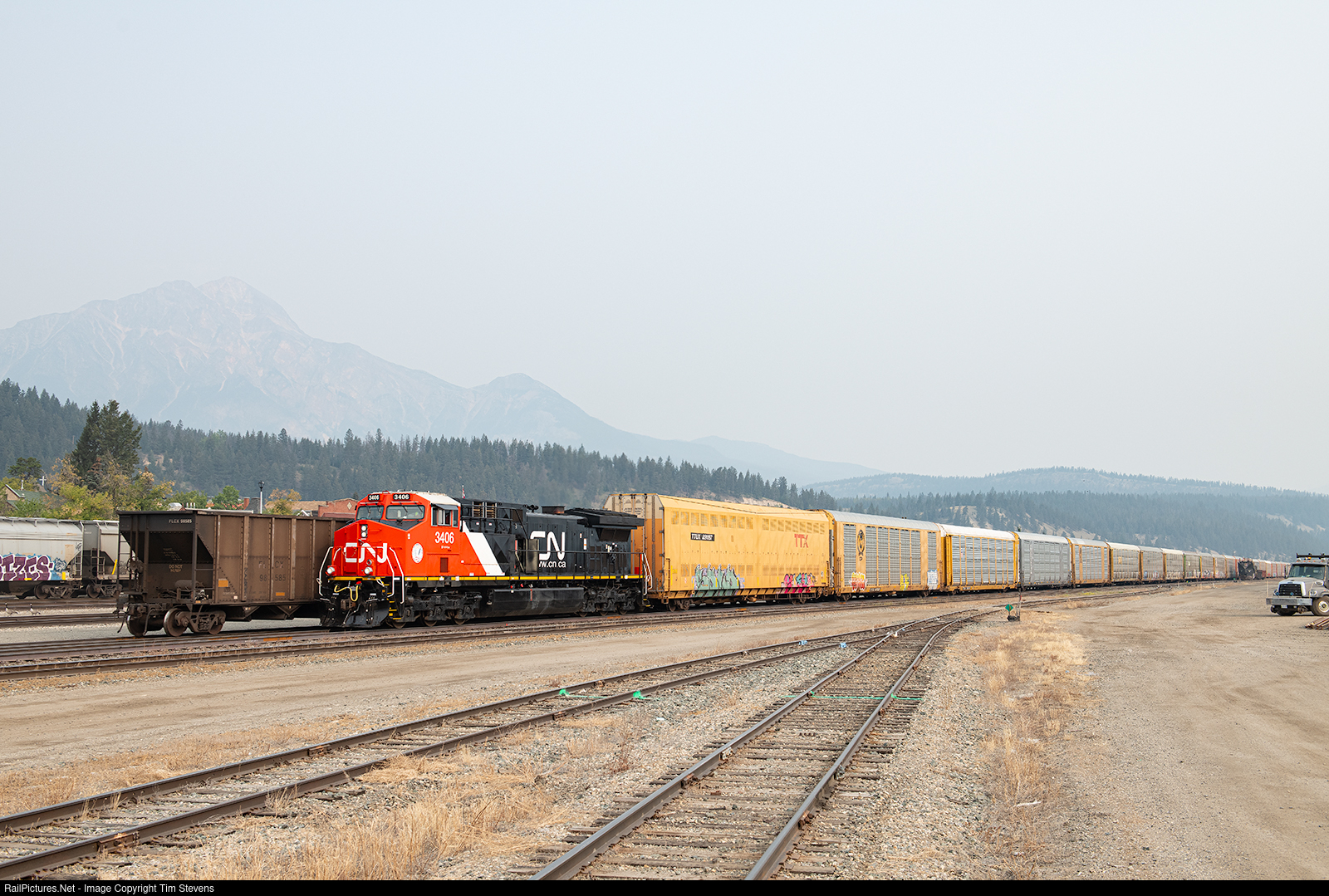 CN AC44C6M 3406 leads E217's empty autos into Jasper for a crew change.