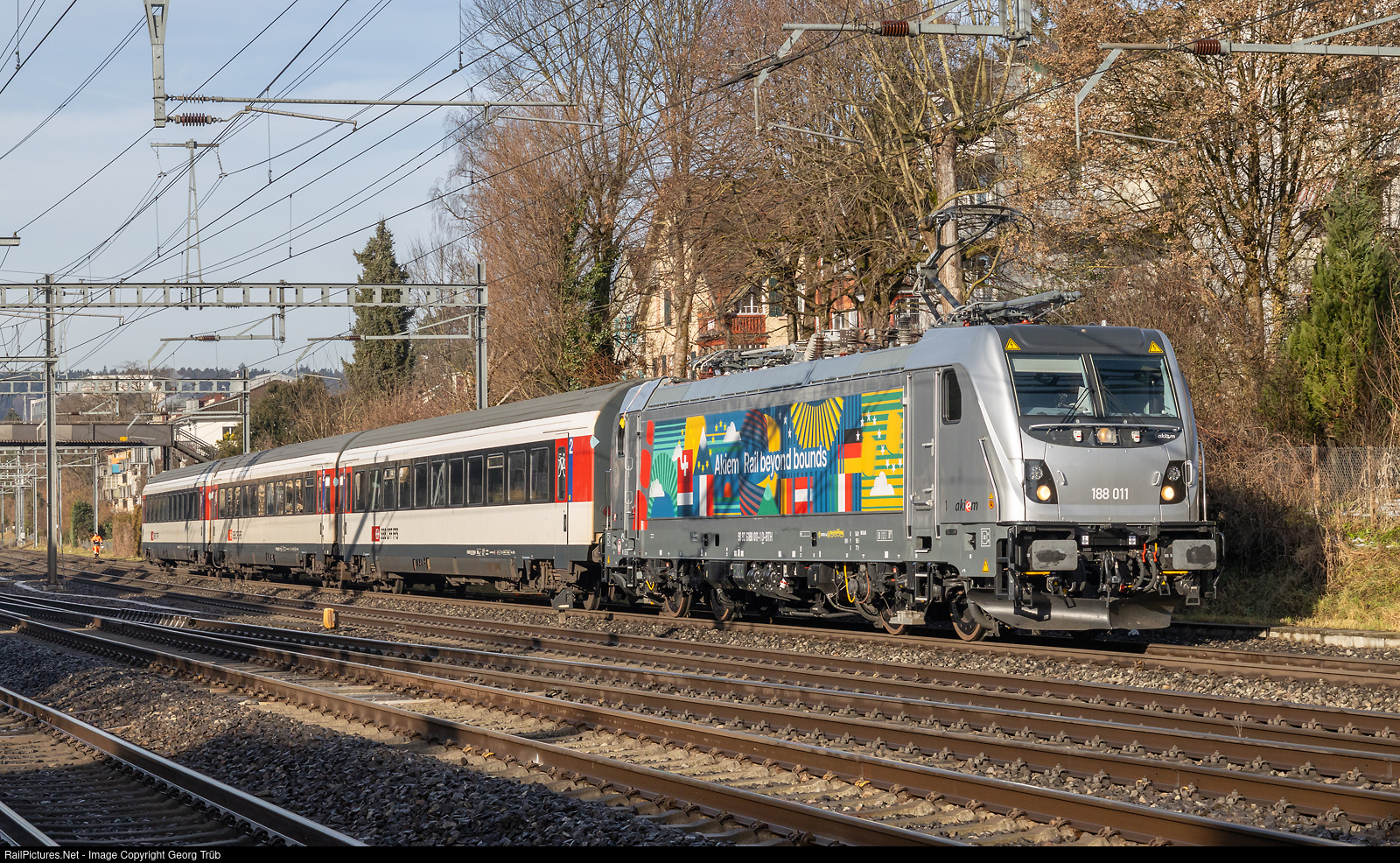 | Alstom TRAXX F160 MS3 188 # 011 of the akiem leasing company, registered with D-BTH (91 80 6188 011-1 D-BTH), pulls the transfer train 97549 of BLS Cargo from Solothurn via Olten-Brugg-Regensdorf-Kloten-Winterthur to Romanshorn Seewiesen. The load are three second class standard car of type EW IV of the SBB. The train made pantograph tests between Grenchen Süd and Solothurn before and will make tests on the Thur valley mainline between Sulgen and Romanshorn Seewiesen the following day. |