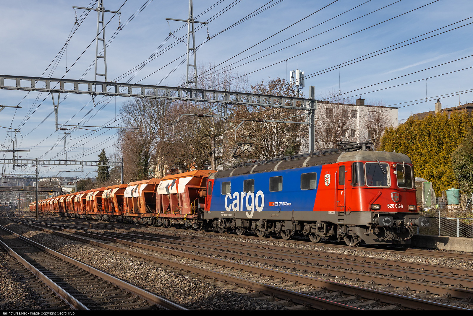 | Re 620 # 019 (Re 6/6 # 11619) of the SBB pulls the loaded Holcim gravel train from Hüntwangen via Bülach-Winterthur to Bürglen, between Winterthur and Oberwinterthur. |