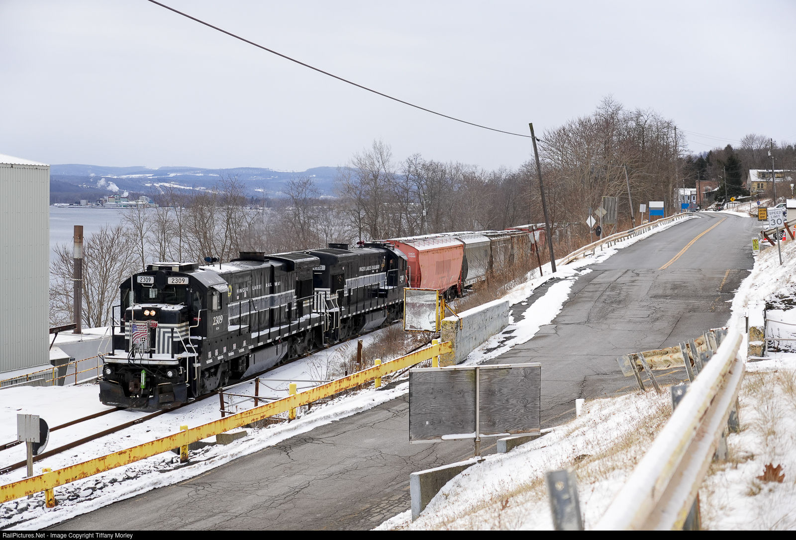 Finger Lakes Railway heads North for Himrod Yard after working Cargill Salt and US Salt. Cargill Salt is seen in the far distance over Seneca Lake.