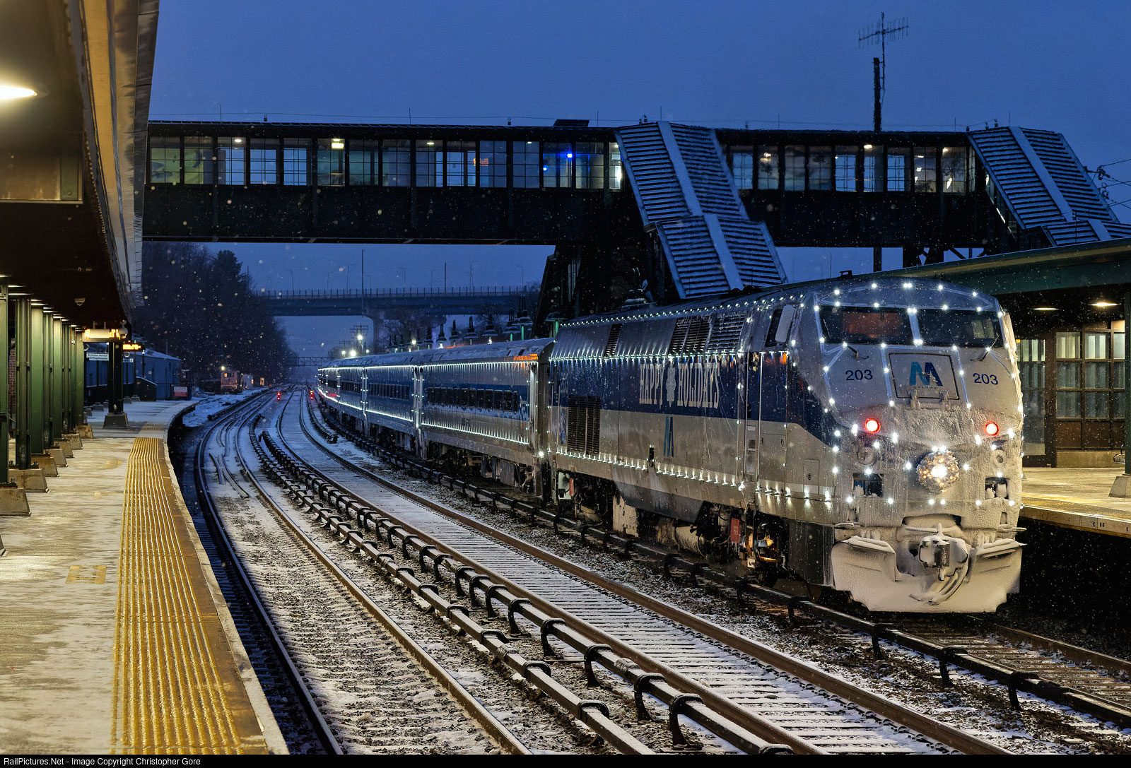 | Light snow is falling, on the last day of Metro-North's Holiday lights train, as it leaves Tarrytown station. |