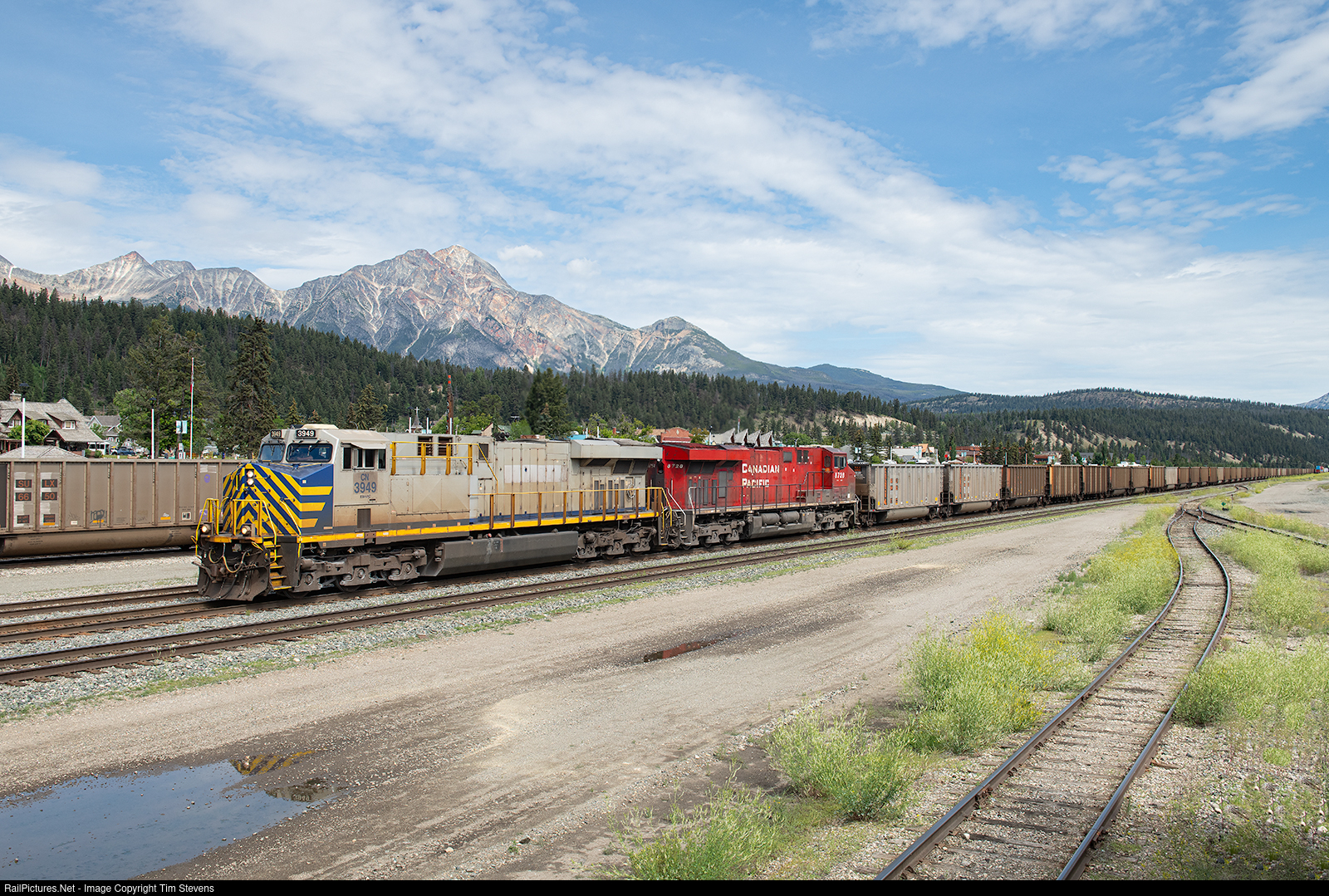 A colourful consist of CN ES44AC 3949 and CP ES44AC 8728 lead a loaded sulphur train into Jasper for a crew change.