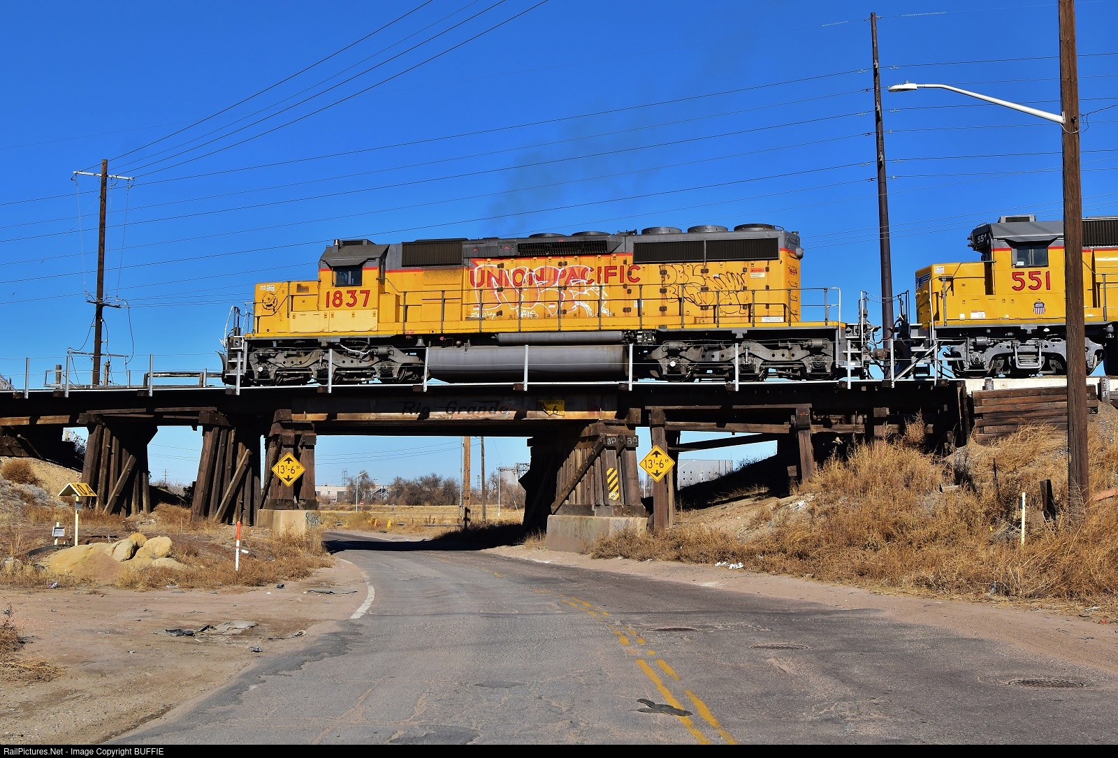 UP 1837 (SD40N) runs over an old Rio Grande bridge in northeast Denver, Colorado.