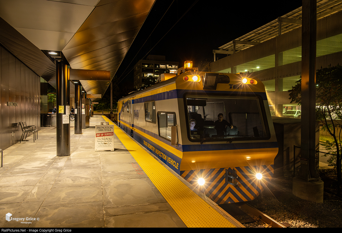 On October 1st, 2025, New Jersey Transit’s self-propelled Track Geometry Inspection Vehicle (TGIV) departs Princeton station on the Princeton Branch in New Jersey, heading back toward Princeton Junction on the Northeast Corridor. Built by Harsco Rail, the TGIV continuously measures track geometry and catenary conditions using an array of non-contact sensors at speeds up to 50 mph. The data gathered provides NJ Transit engineering teams with a detailed view of track condition, supporting proactive maintenance and long-term infrastructure planning.