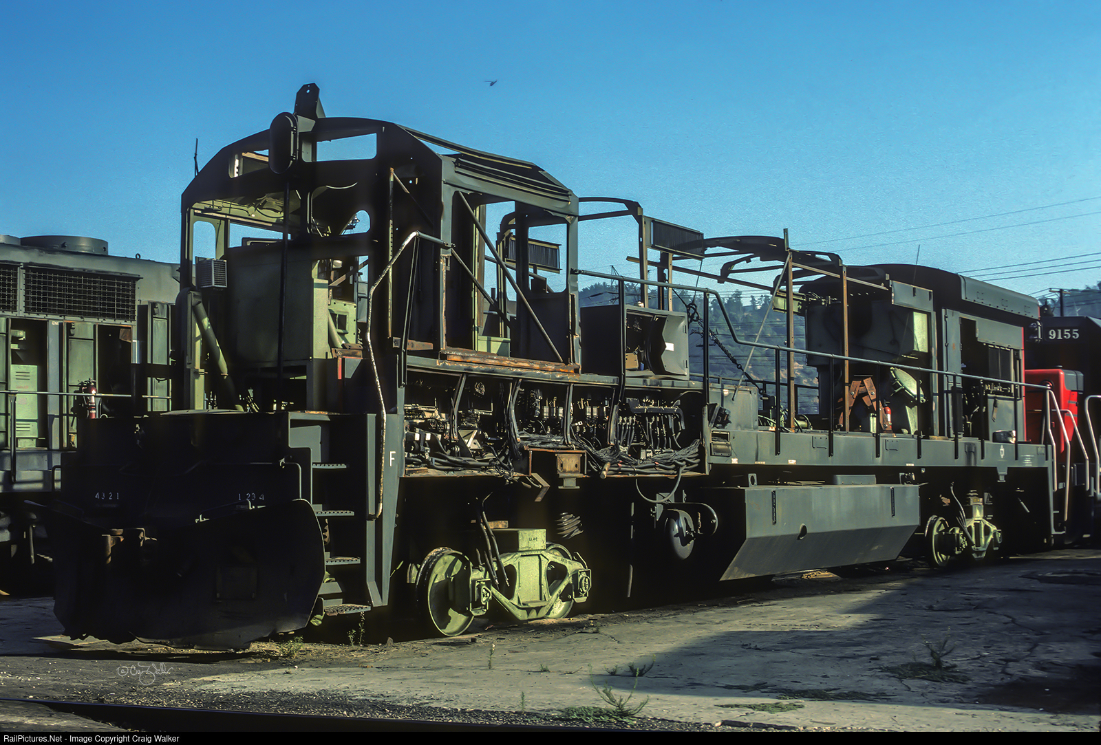 Just two-and-a-half years old, Southern Pacific U33C has been stripped to its bare bones and sits on a whisker track at Southern Pacific's Taylor Yard, in Los Angeles CA, due to being a bit too close to an exploding tank car in Englewood Yard (in Houston TX) on September 21, 1974. This hulk was sent west to Los Angeles' Taylor Yard, whose shop forces were well equipped to rebuild this U-Boat. Fortunately, the LA workers did, in fact, restore SP 8774!