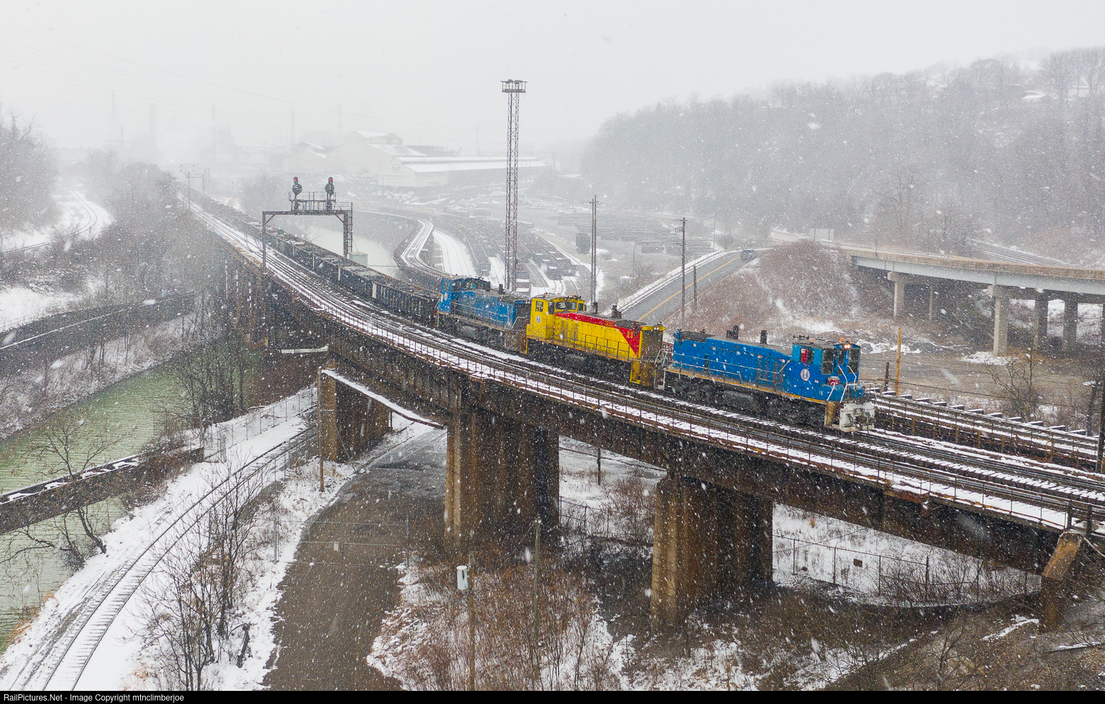 As a snow squall moves through East Pittsburgh, Pennsylvania, the Union Railroad Job 95A crew brings scrap loads an slab empties across the Turtle Creek bridge with a trio of MP15's. The crew will proceed north to clear the next switch, then shove their train down the ramp into the US Steel Edgar Thompson Works complex.