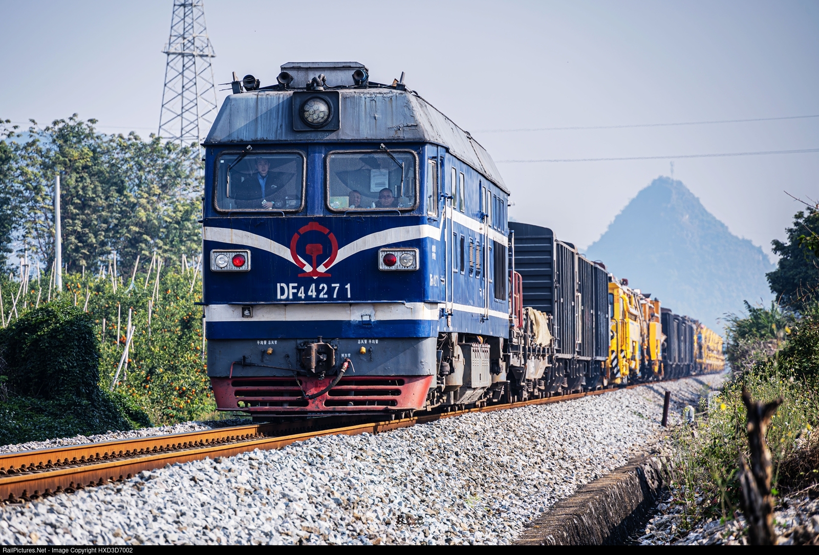 Two DF4C locos pull-push the ballast undercutter machines returning the station after construction finished.