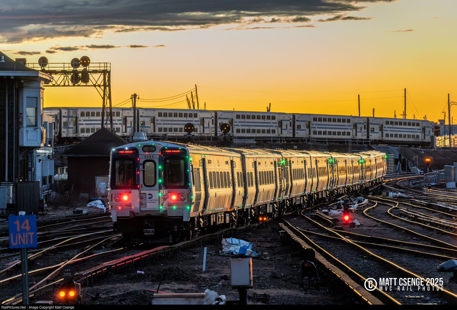 Off Into the Sunset. Long Island Rail Road (LIRR) M9 car 9060 brings up the rear of Babylon Branch train 169 as it departs Jamaica Station. The train is decorated with festive lights for the holiday season, and this would be one of the last few days that it would run as the railroad's Holiday Lights Train.