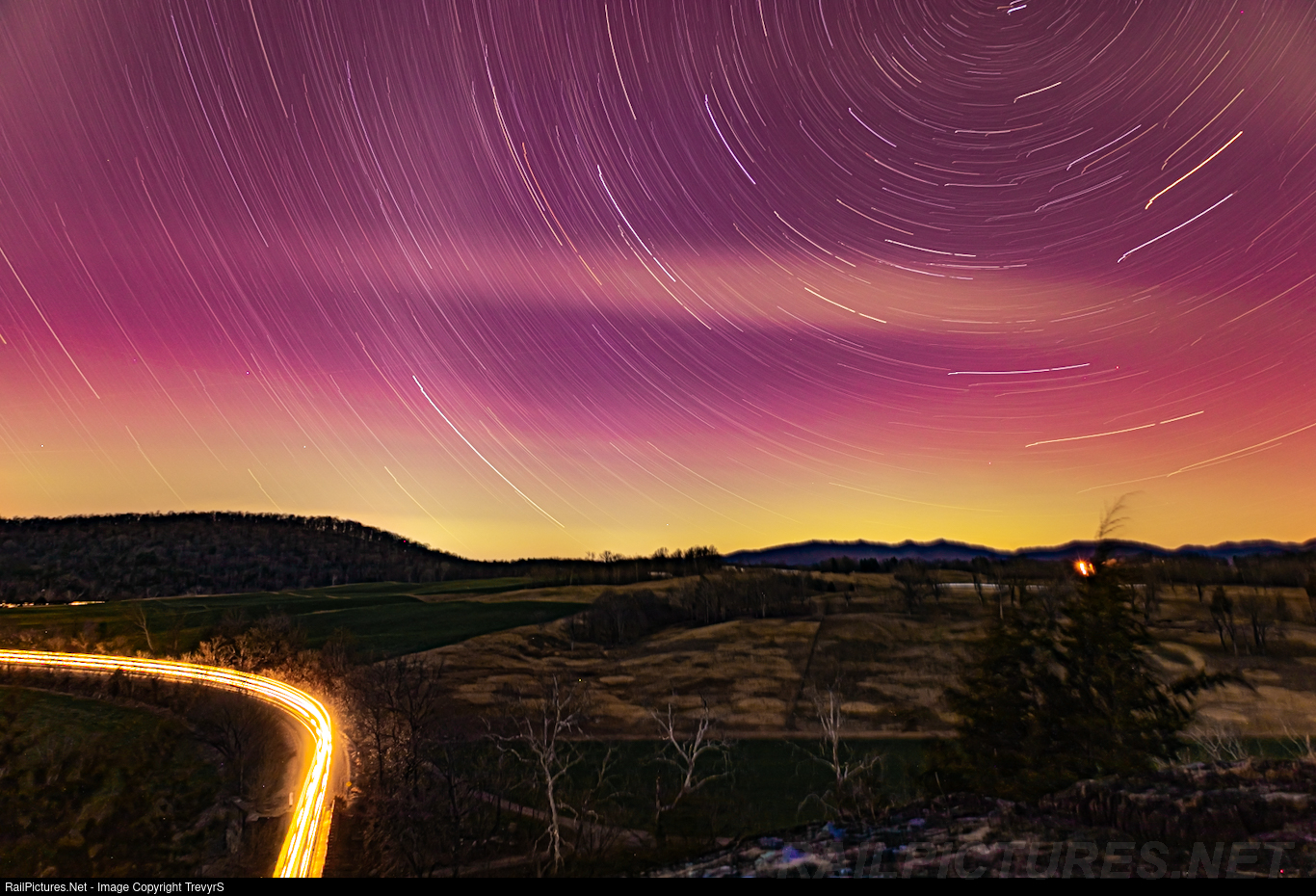An 81 minute exposure captures C208 winding through the James River basin under a sky on fire with the aurora.