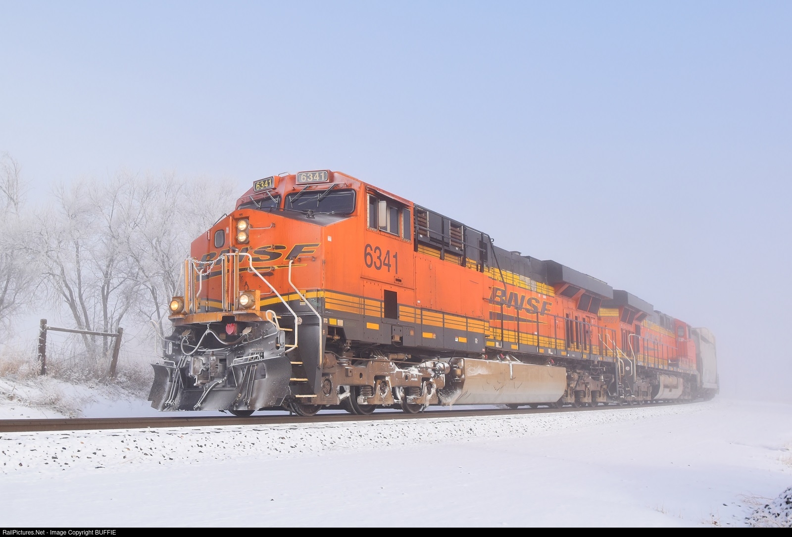 | Thick fog and freezing frost blanket the Front Range Sub as BNSF 6341 (ES44AC) leads a freight through Highlands, Colorado.