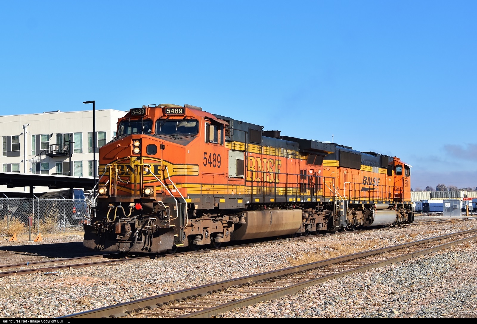 | BNSF 5489 (Dash9) and BNSF 9716 (SD70MACe) work the Longmont Switch running between Longmont and Fort Collins, Colorado on the Front Range Sub.