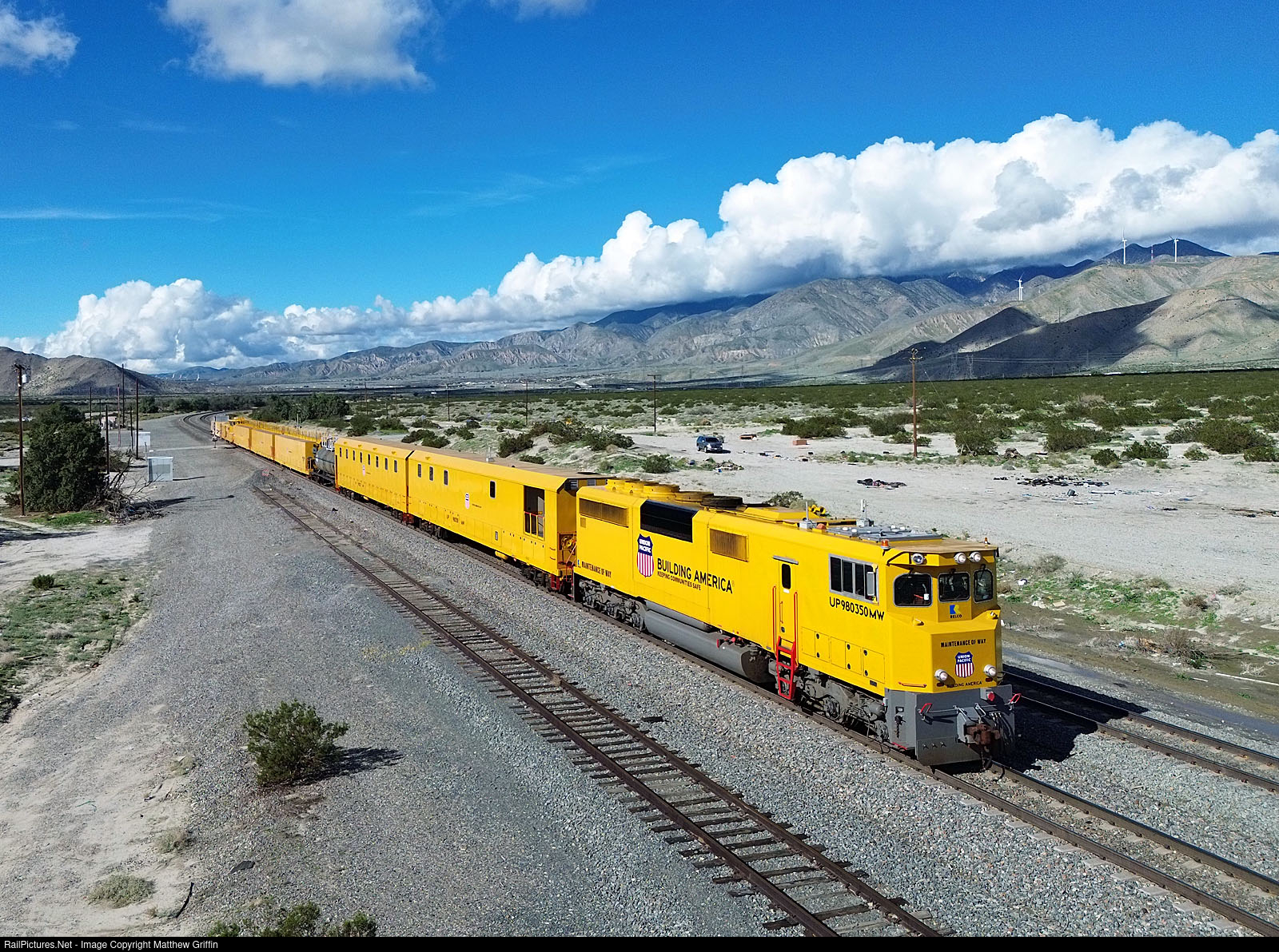 UP 980350MW leads an eastbound work train through West Palm Springs.