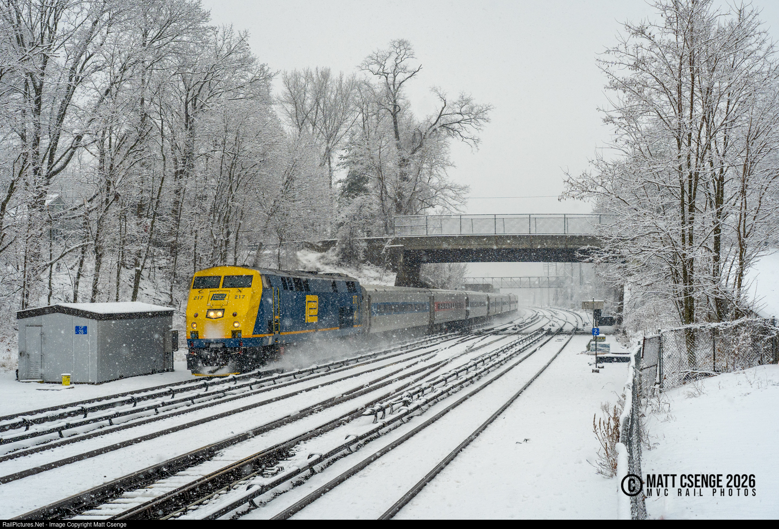 Metro-North Railroad (MNR) P32AC-DM no. 217, the railroad's Penn Central heritage unit, is seen blasting through the snow at Philipse Manor Station as it races towards Poughkeepsie with Hudson Line train 8827. |