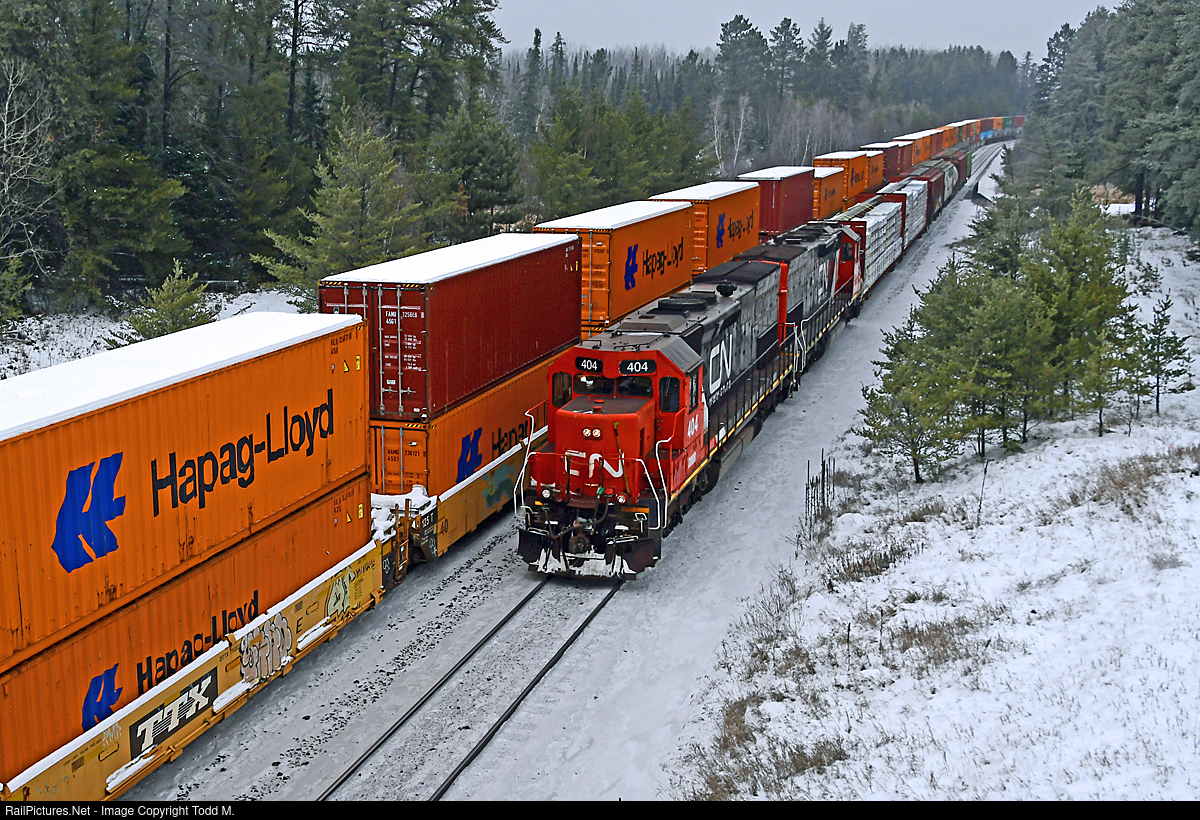 | A pair of DMIR locomotives pull a few cars from CN's yard at Two Harbors and are nearing their end point at CN's Keenan yard on this frosty afternoon. They'll have to slow up a bit to allow this container train to clear before they cross over and shove into the yard. |