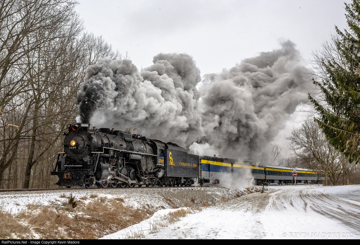 This image was captured on Michigan's Great Lakes Central Railroad. The featured locomotive is actually Pere Marquette Railroad N-1 Class, 2-8-4 "Berkshire" Locomotive #1225, which was re-lettered as C&O 2699 for a January 2026 photo shoot organized by Lerro Photography. The 1225 was re-lettered to represent the former PM N-Class Berkshires, which were renumbered when the Pere Marquette Railroad merged with the Chesapeake & Ohio in 1947.