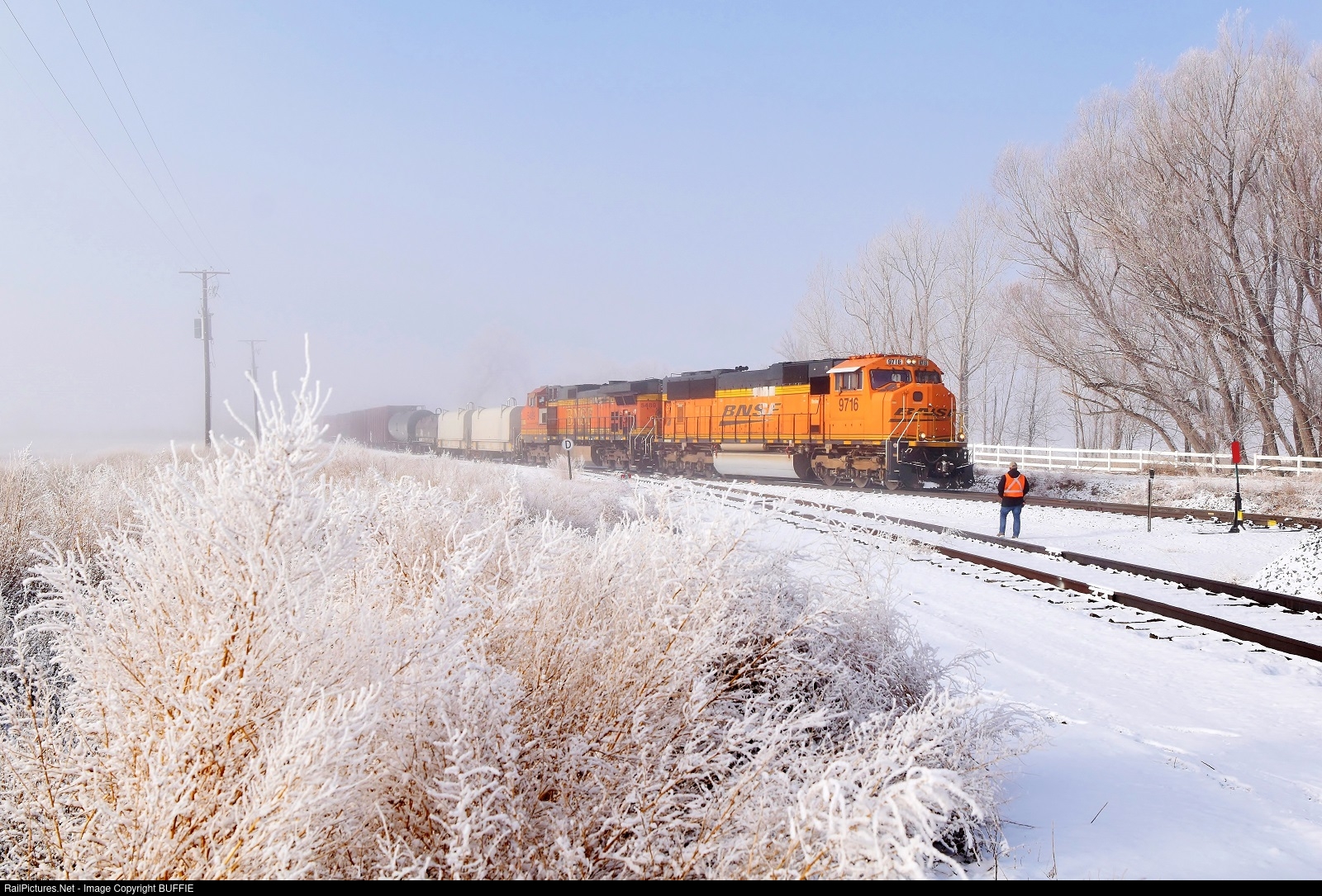 | Thick fog and hoar frost cover the trees and grass as BNSF 9716 (SD70MACe) gets ready to head to Berthoud, Colorado on the Front Range Sub. |