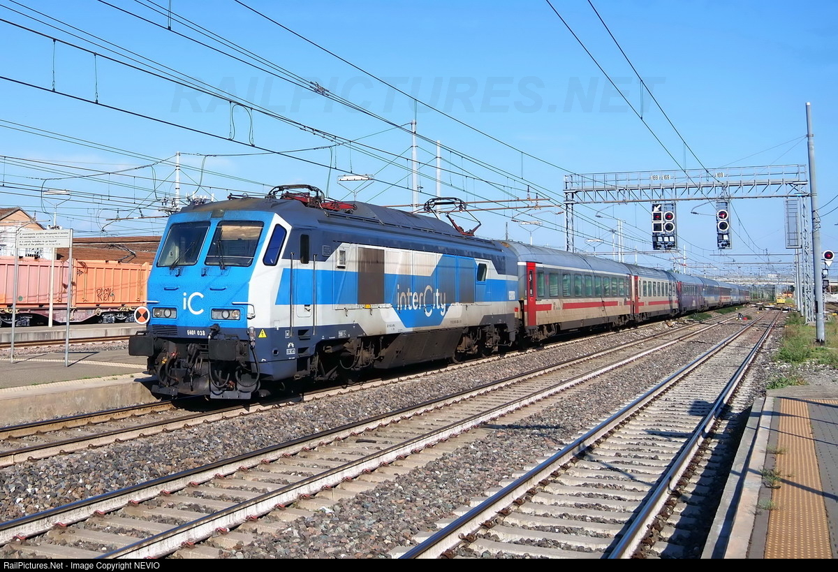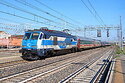 | Trenitalia locomotive E 401-038 arrives in Reggio Emilia at the head of an Intercity train. It wears the new livery for this type of service, but the carriages have a mix of previous liveries. |