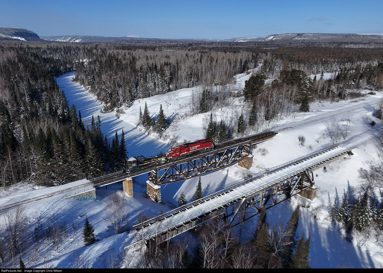 | On a very frigid Friday afternoon (-24c ambient) CPKC ran a snow spreader west across the 132 mile Nipigon Subdivision from Schreiber to Thunder Bay. After cleaning up Sprucewood they are on their way west crossing over the Black Sturgeon River at mile 74. CP SD60 6239 was tasked to shove CP Jordan Spreader 402886 built in 1966 and assigned to the Schreiber Division. CN's former Kinghorn Subdivision ran in close proximity to Canadian Pacific's rails for a few miles in the area and saw its last revenue train in 2005 and the 190 mile Kinghorn Sub between Longlac and Thunder Bay was dismantled by 2010. |