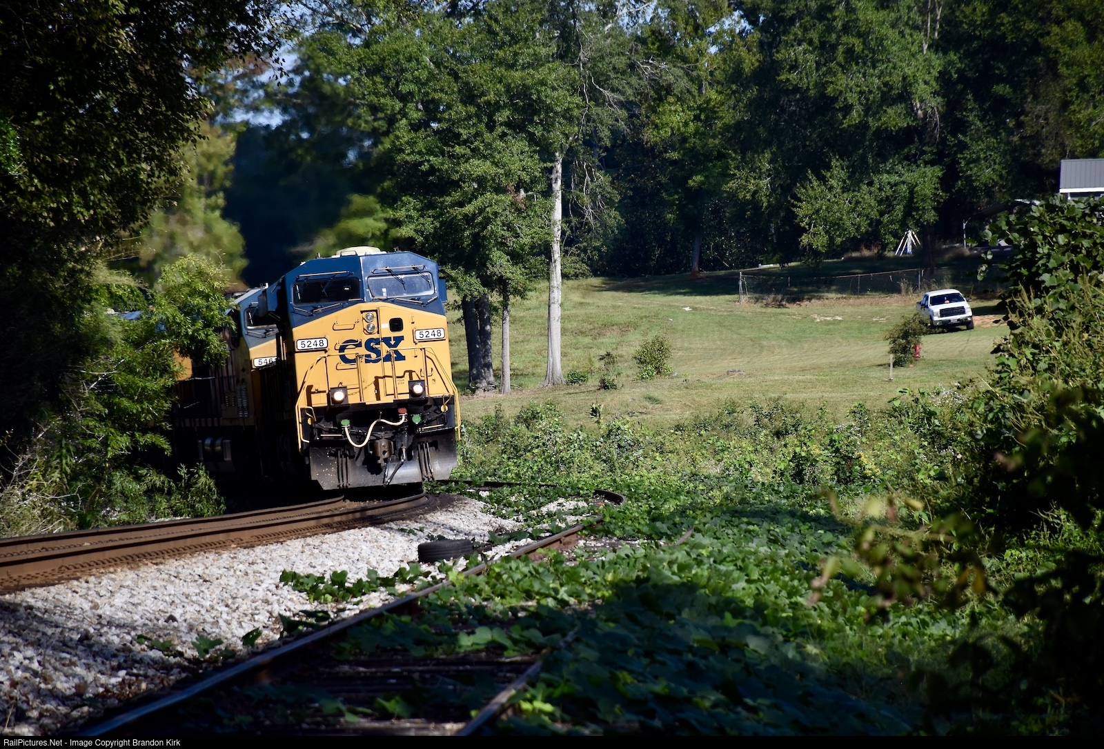 | Behind this leader is two more CSX locomotives and cars loaded with ballast... The siding here looks be under attack by kudzu. It actually has reached the mainline, but high traffic has stopped its progression. |