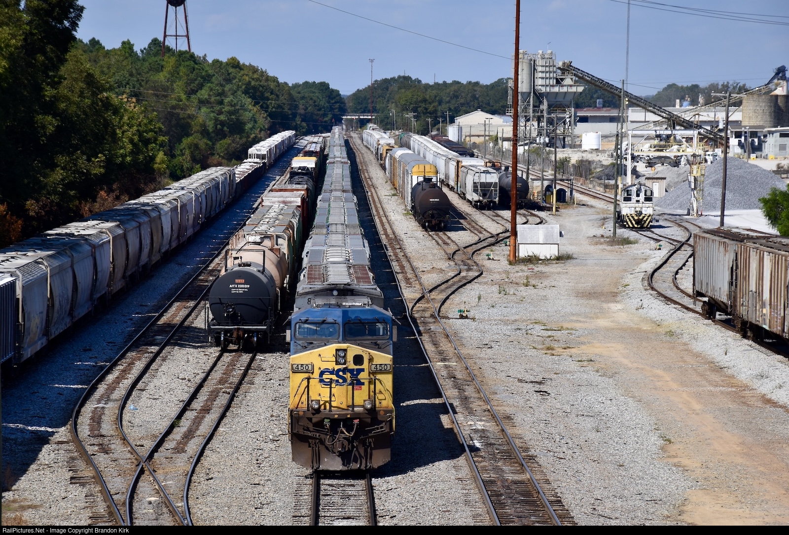 | On a clear day in the city of Dothan, the CSX Yard is busy and full of cars. A train points southward tied down till a crew is called out for it. CSXT #450 still wears the Bright Future scheme that it was originally painted in. |