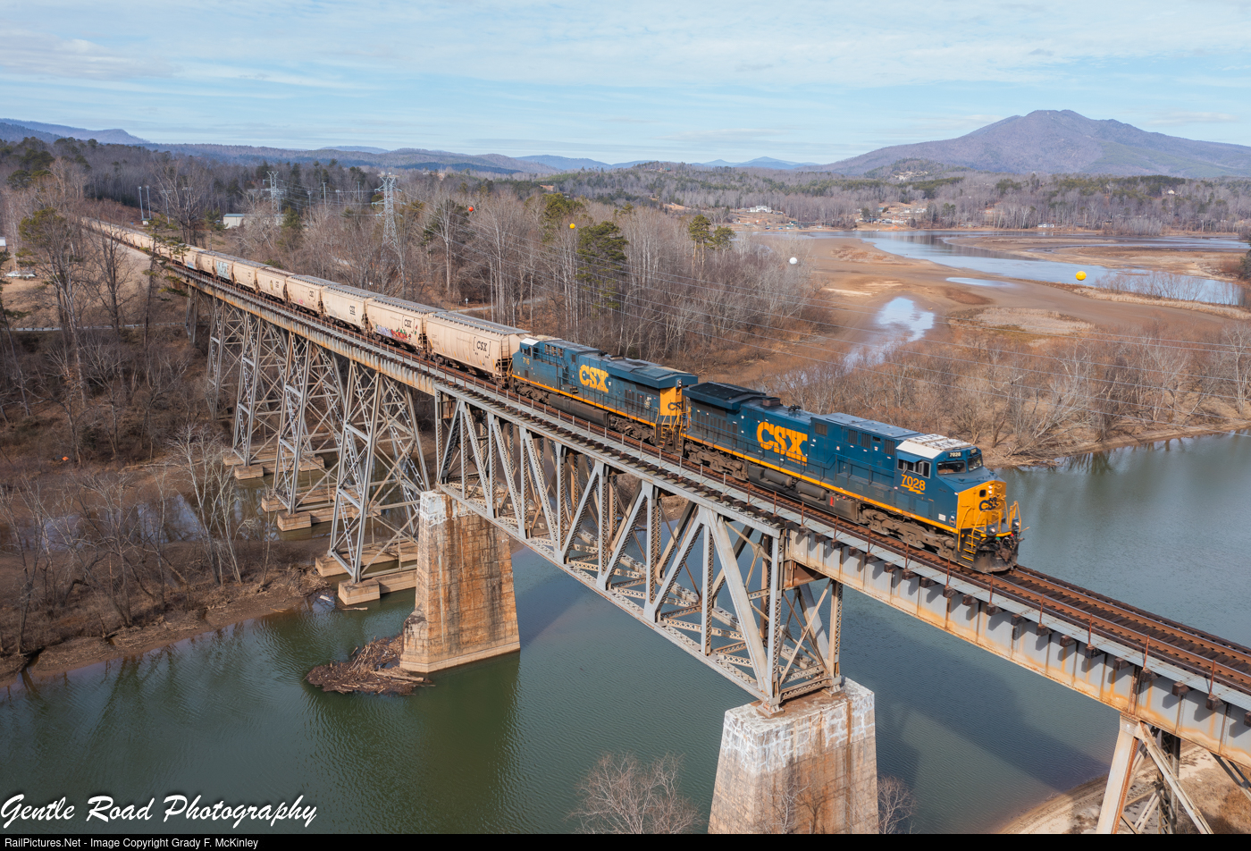 | Wixom, MI grain loads cross the trestle over Lake James/Catawba River near Marion, NC. |