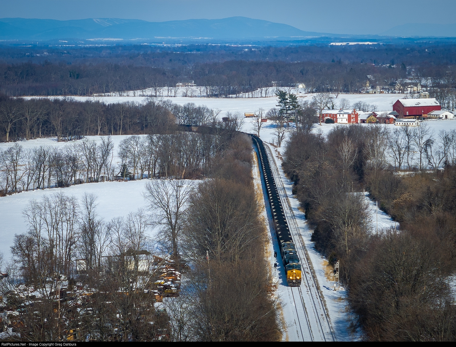 A CSX coal drag stretches out on a straighaway on the CSX Cumberland Sub after a snowfall the night before.