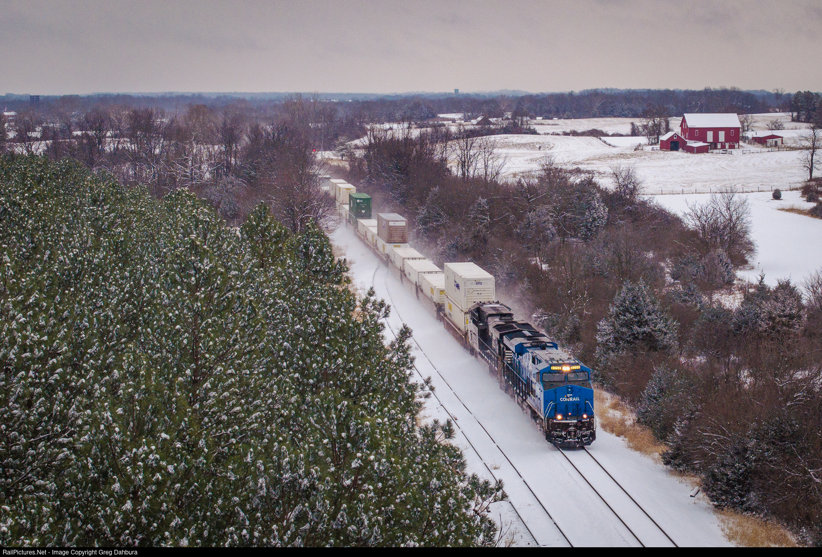 25A barrels through White Post with the "Conrail" heritage unit leading through a sea of pine trees.