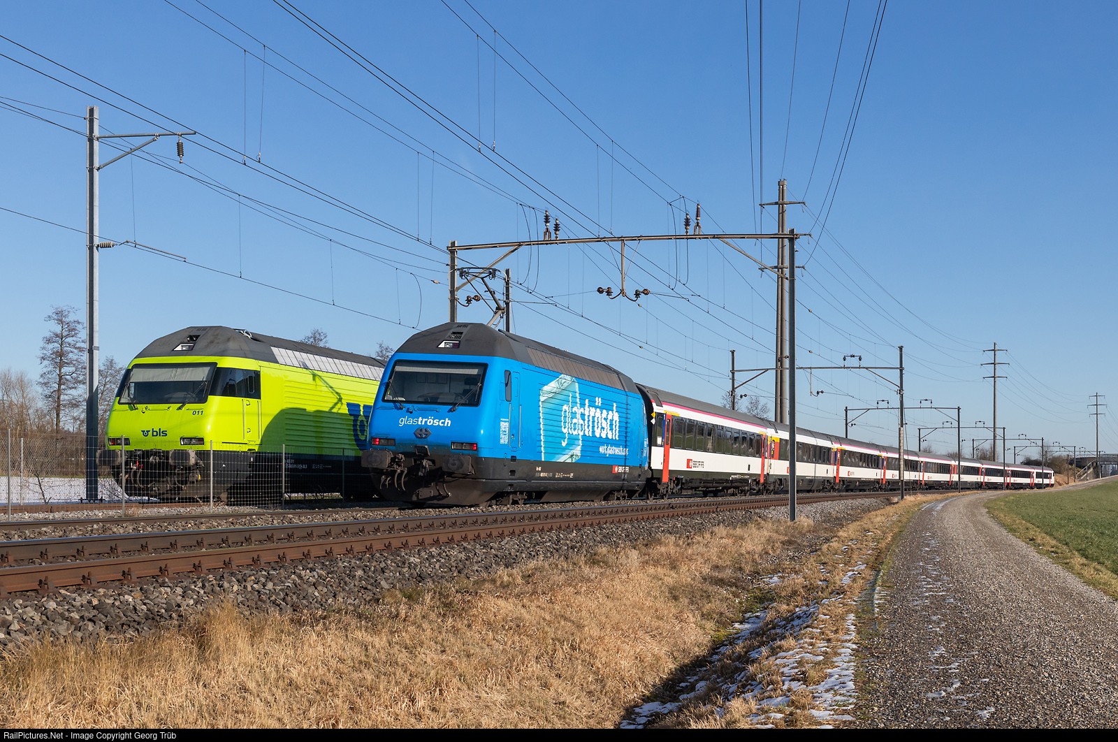 | Re 465 # 011 of the BLS was taken over by StadlerRail in january 2026 for transfer runs, and is standing in the stub track of the Erlen commissioning centre, while IC 10817 relief push-pull train of the SBB from Zürich to Romanshorn is passing by, shoved by Re 460 # 011 in the blue "Glas Trösch" publicity paint scheme. |