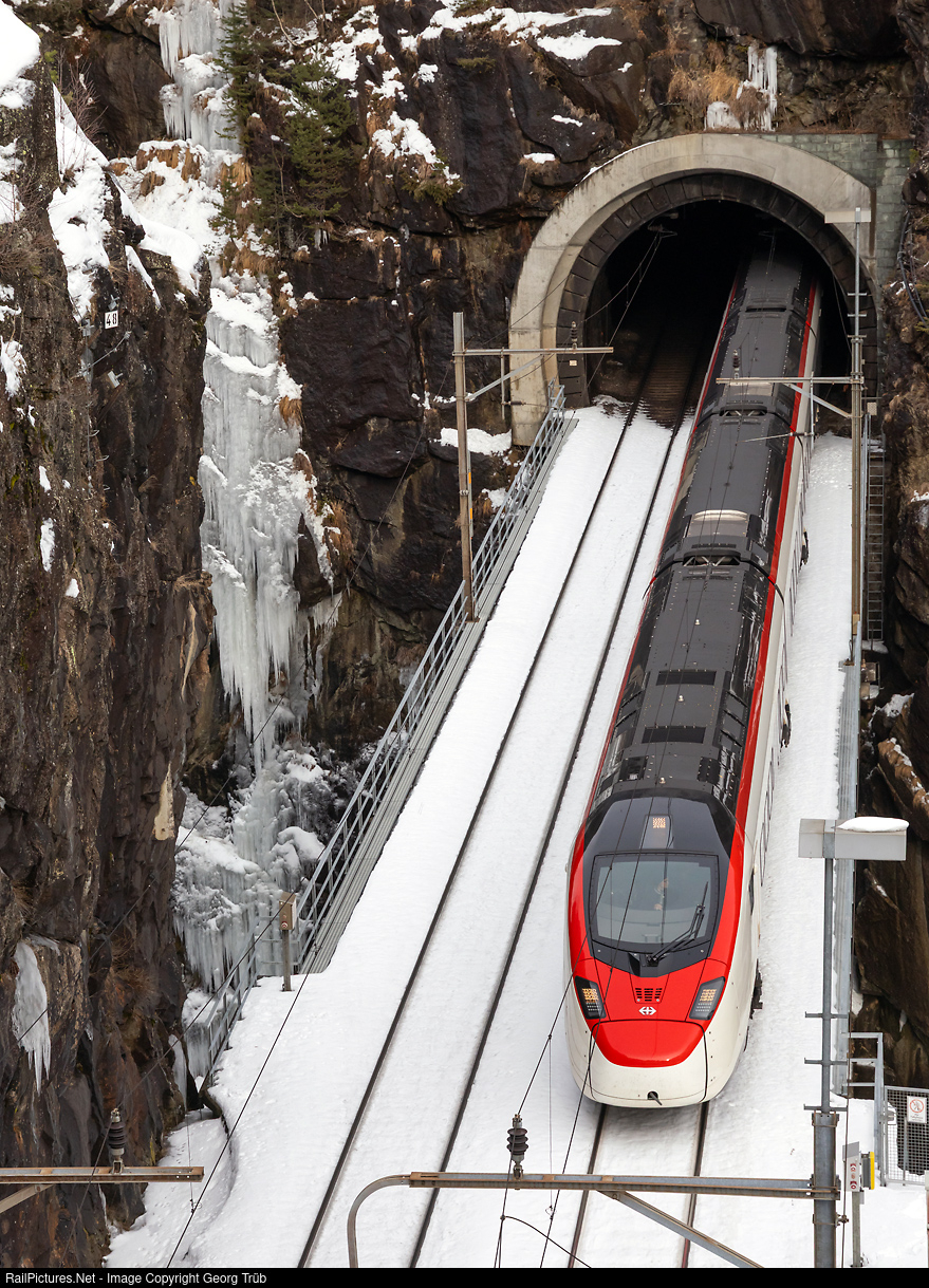 | Due to planned maintenance work in the Gotthard Base Tunnel, most passenger trains will be diverted via the Gotthard mountain route from January 13 to 24, 2026, to ensure that sufficient slots are available for freight traffic in the base tunnel. An unknown "Giruno" RABe 501 of the SBB is leaving the Leggistein loop tunnel and crossing the upper Meienreuss bridge between Wassen and Göschenen, running as IC 10017 from Zürich to Chiasso. |