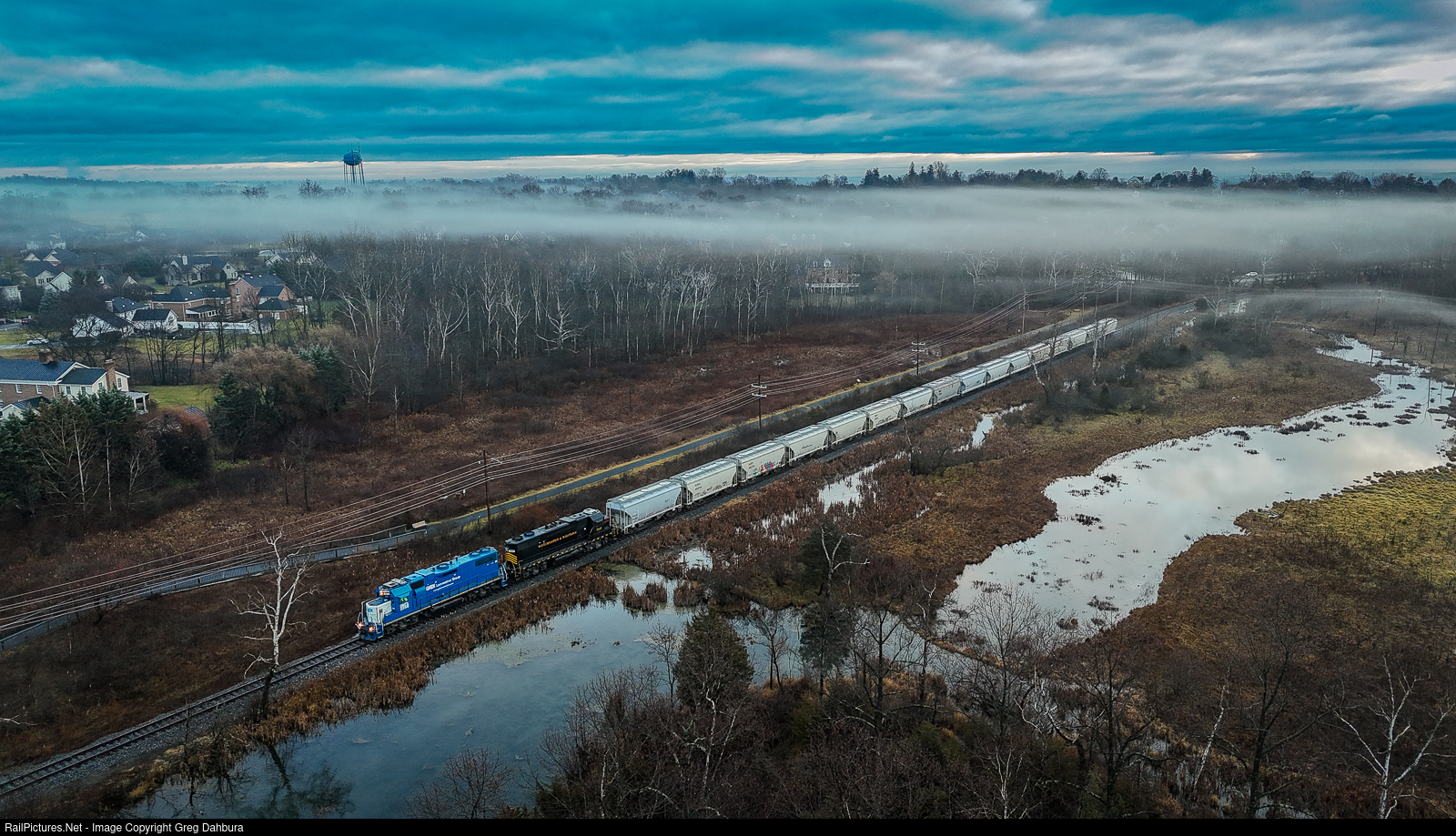 | The WW102 heads through Abrams Swamp with some low clouds lingering. This was one of the last full trains to the Covia facility in Gore. |