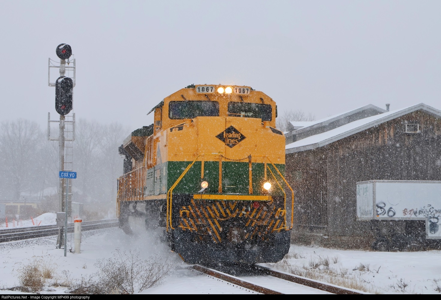 | NS train 265 with the Reading heritage unit leading comes off of CSX and onto home rails at CP-VO during the largest snowstorm the area has experienced over the last few years. This is the new connection that NS recently completed that allows double stack trains to use CSX to access New England. |