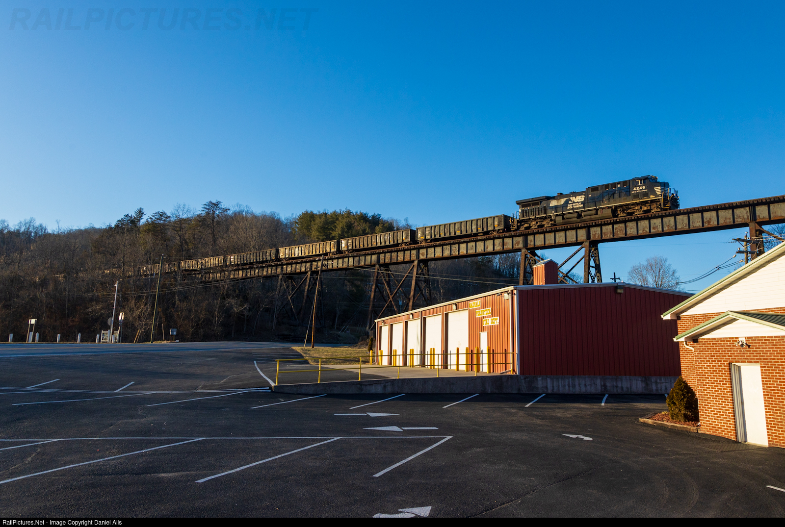 | NS J40 rolls east across the trestle in Oakvale, WV on the Princeton Deepwater District. It will stop just ahead in Kellysville to tie down for the night. |