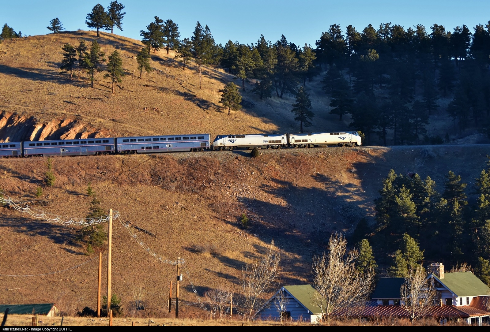 | Amtrak engine #10 (P42DC) leads the Winter Park Express Ski Train up to Tunnel #1 on the Moffat Tunnel Sub at Plainview, Colorado. |
