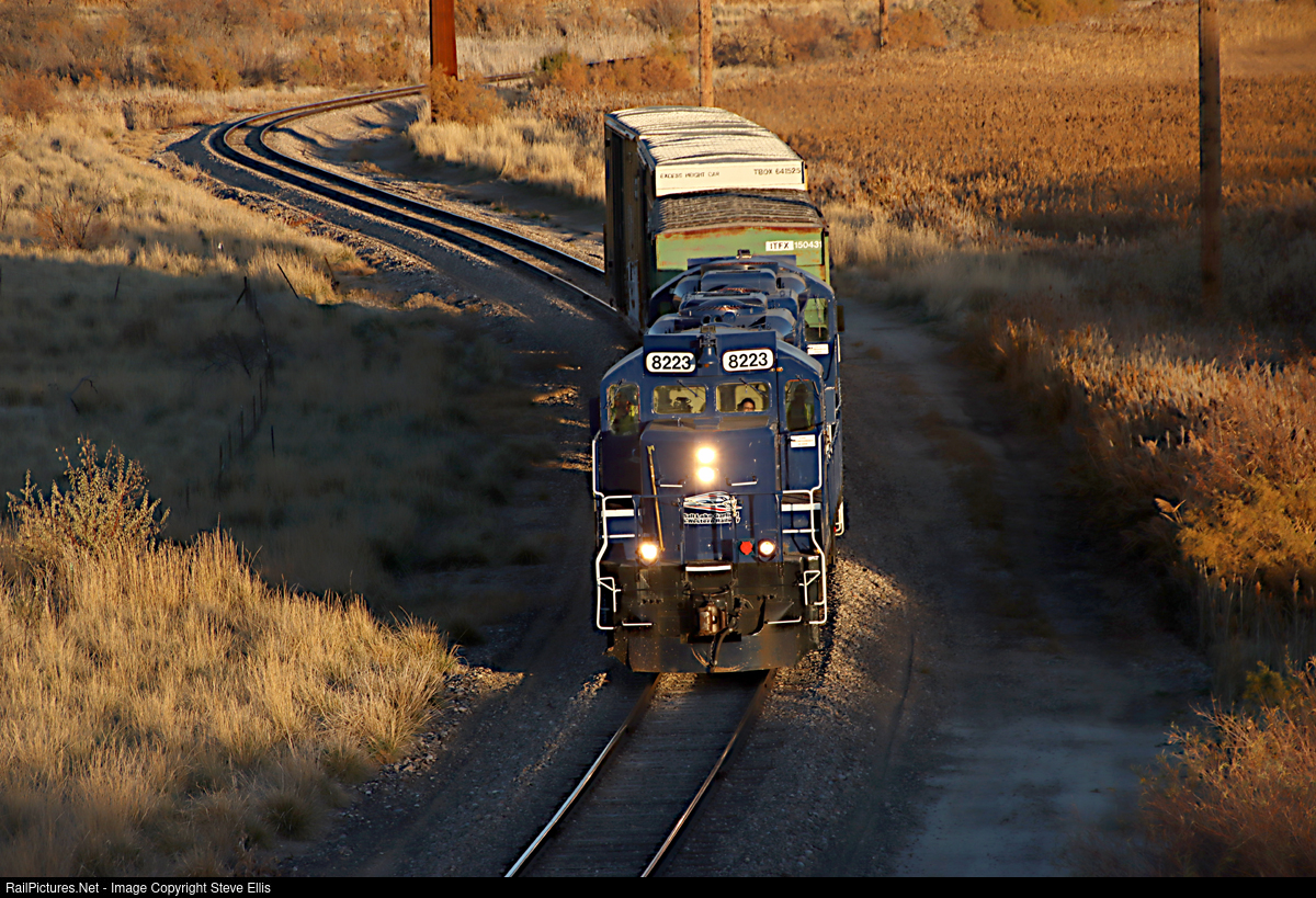 | With the sun about to set. The Salt Lake Garfield and Western GP9's 8223, 8201 near the yard at the western end of their line. |