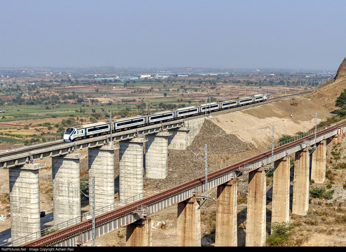 20674 Pune Kolhapur Vande Bharat Express cursing through the newly constructed concrete bridge (longest bridge of Shindwane Ghats). The old girder bridge is visible to the right.